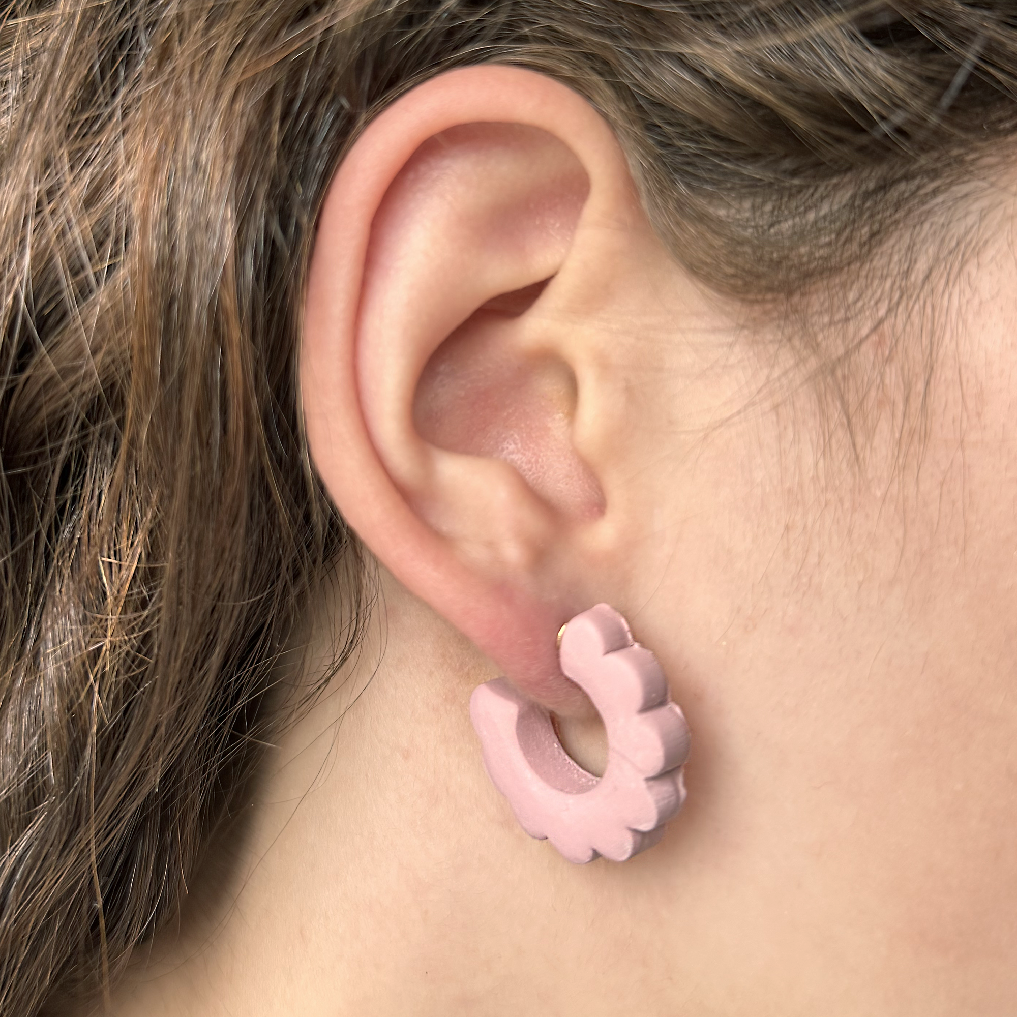 The Cloud Hoops Blush earrings are designed with an elegant scalloped edge that adds a touch of sophistication to their appearance. They boast a chunky, contemporary style that is both trendy and eye-catching. Easily making them a perfect accessory for any outfit. Despite their bold design, these earrings are crafted to be ultra-lightweight, ensuring they are comfortable to wear throughout the day. They are finished in a delicate soft blush hue, providing a subtle yet stylish pop of colour. Additionally, the Cloud Hoops are equipped with hypoallergenic studs, making them suitable for sensitive ears and offering stylish. Everyday comfort without compromising on safety.