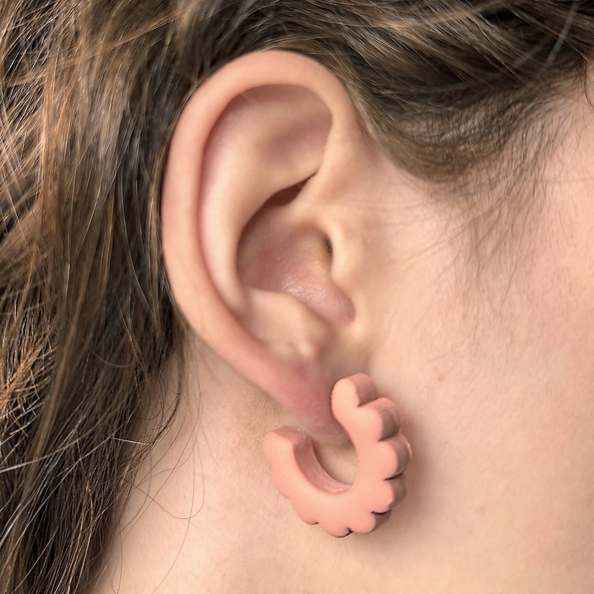 Cloud Hoops Light Terracotta earrings – designed with an elegant scalloped edge that adds a touch of sophistication to their appearance. They boast a chunky, contemporary style that is both trendy and eye-catching, yet they maintain an ultra-lightweight feel. This ensures they are comfortable to wear for extended periods. These earrings are finished in a soft, warm terracotta colour, which complements a wide range of skin tones and outfits. Additionally, they are equipped with hypoallergenic studs. This also makes them suitable for those with sensitive ears. Providing stylish, everyday comfort without compromising on safety or quality, for everyone! So pop your new favourite Cloud Hoops on!