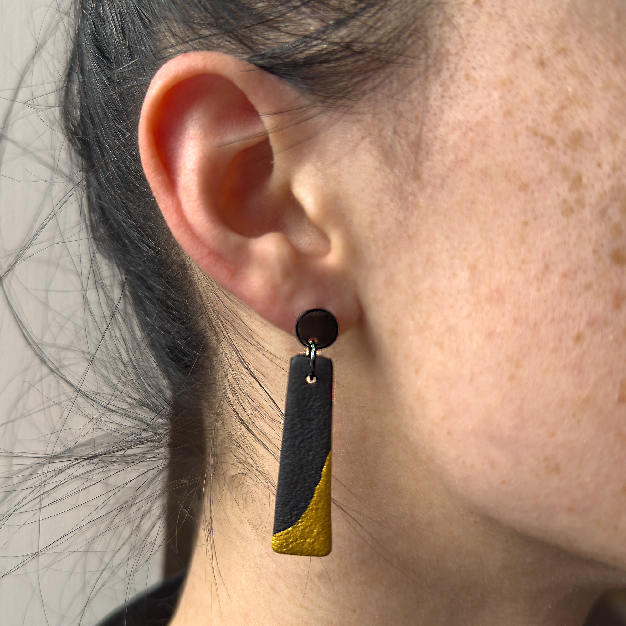 The Demi Drop Earrings in black and gold painted polymer clay bar earrings offer a bold yet refined look. Blending modern design with hand-crafted detail. Finished with a smooth round black stud, they create a significantly striking contrast that elevates both casual and dressy outfits. Surprisingly lightweight, durable and uniquely made, they’re the perfect accessory for anyone who loves chic, contemporary style.