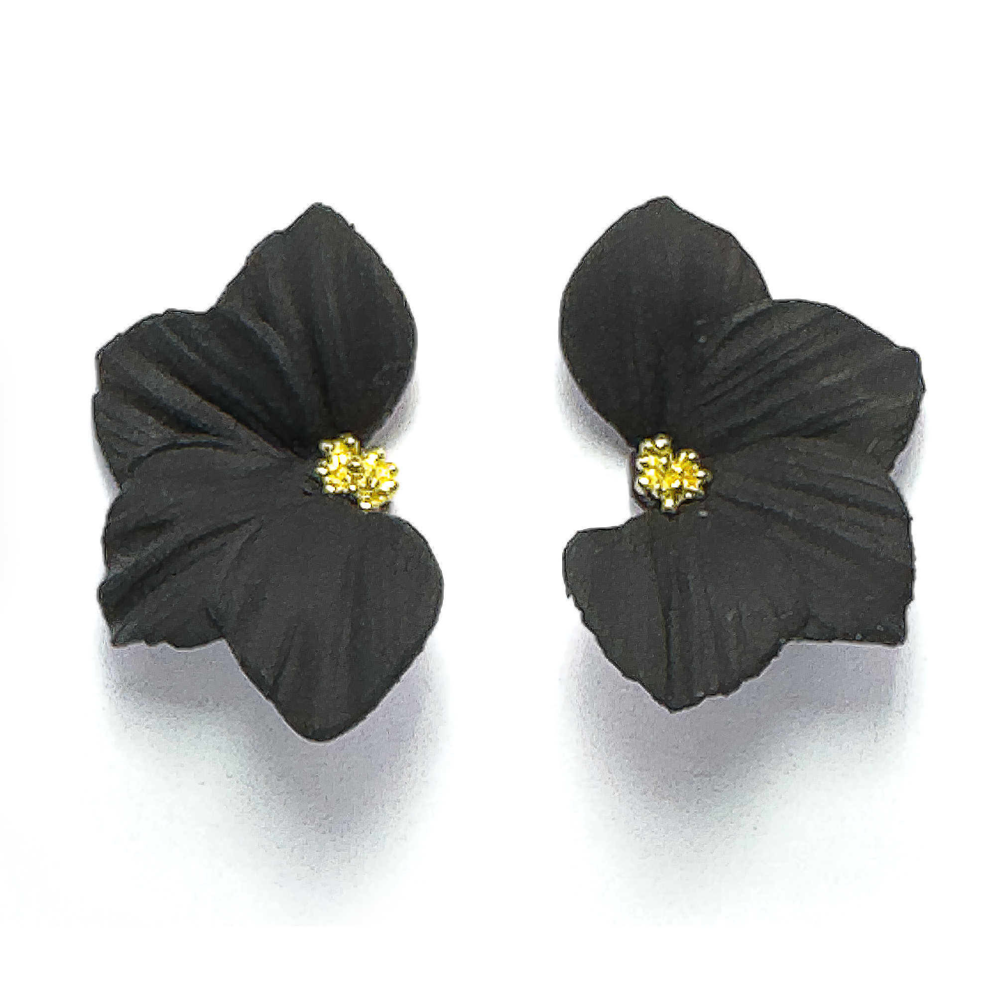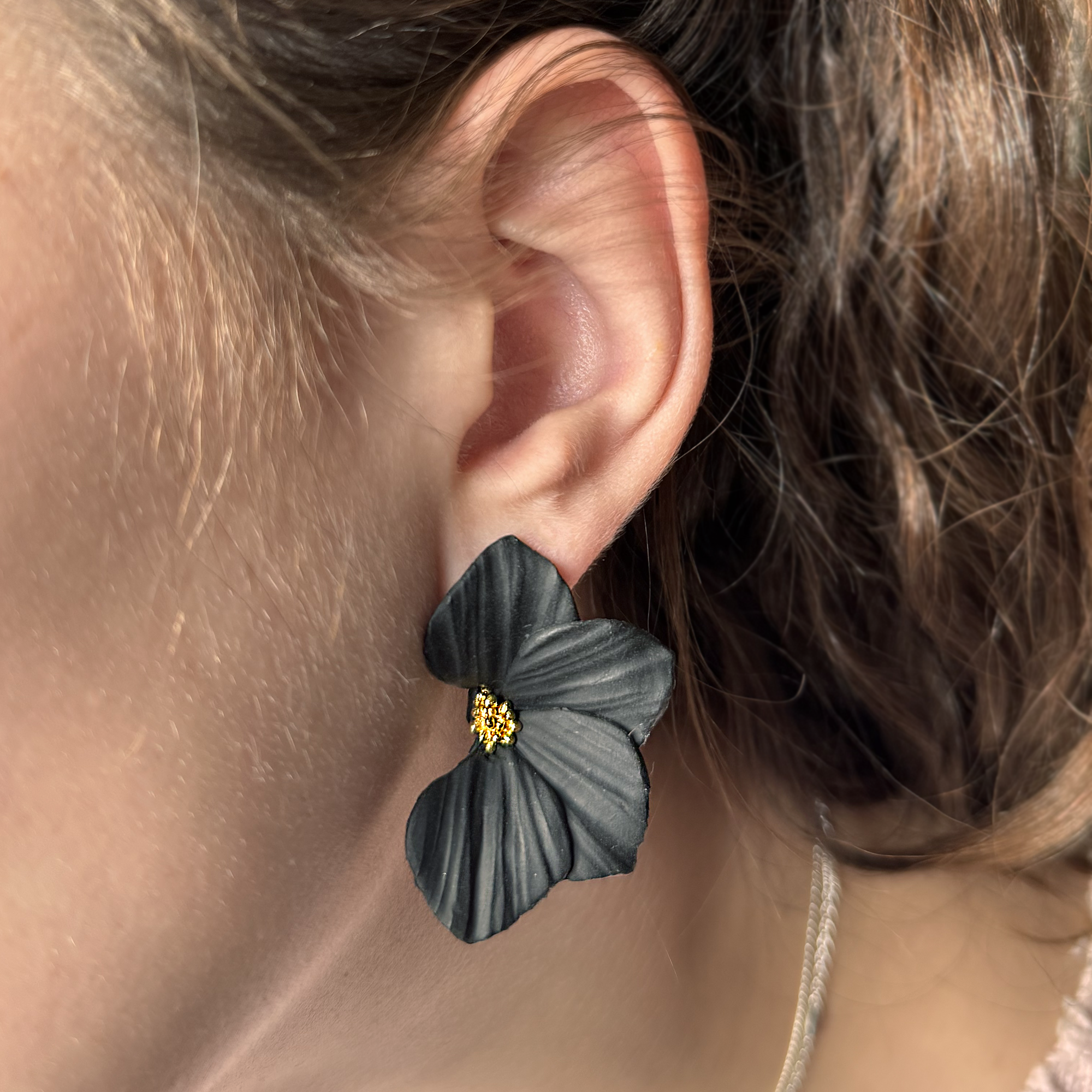 The Ella Grande Black are the perfect statement earring! A must if you want to your ears to be noticed! One of our best sellers, they offer bold, delicate petals gracefully clustered around a radiant gold stamen centre. Creating a beautifully sculpted floral design. Elegant yet bold, these earrings make a stunning statement piece. Perfect for elevating both everyday outfits and special-occasion looks with effortless feminine charm.