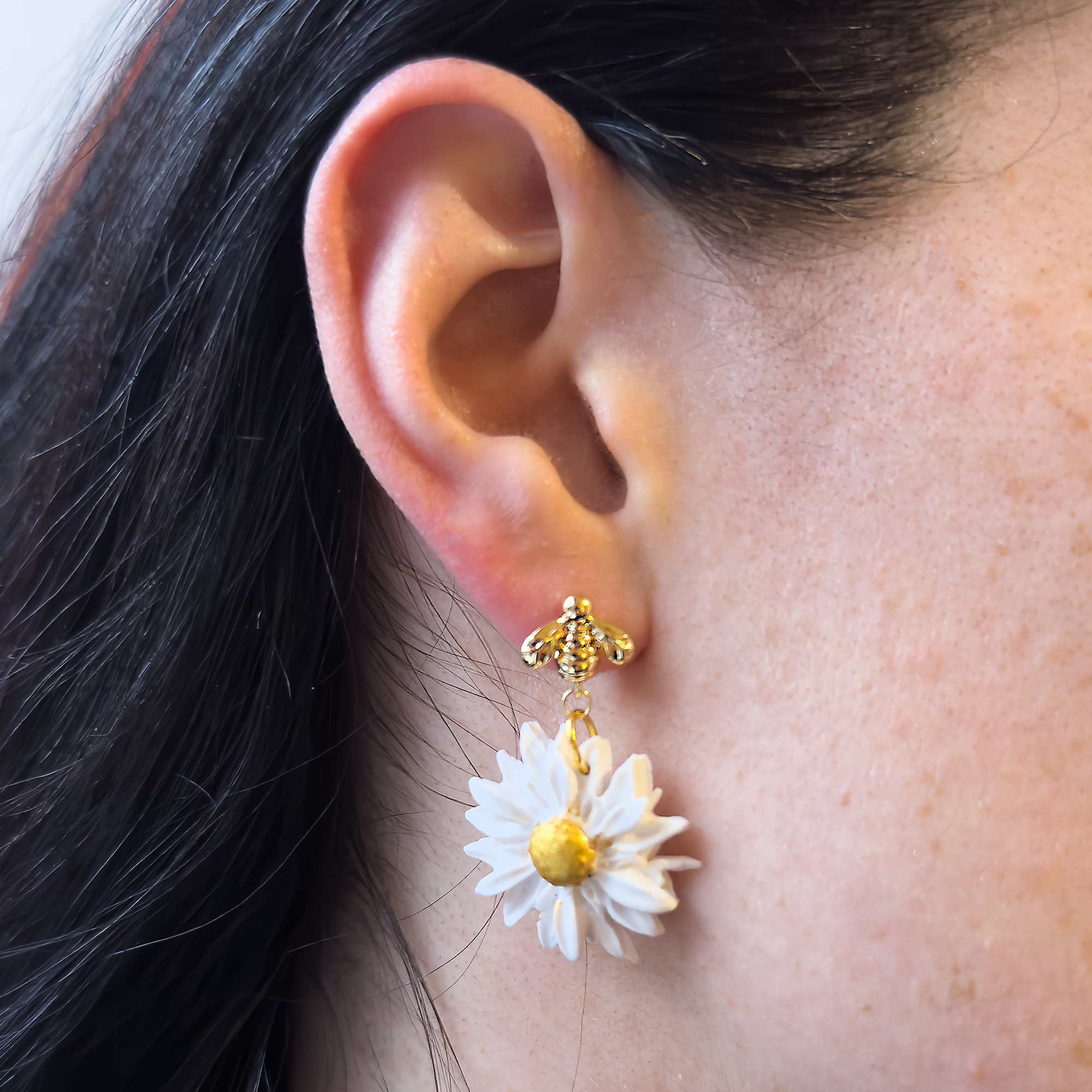 Gold bumble bee earrings with fresh white daisies—charming, nature-inspired, and the perfect gift for any bee lover. Handmade polymer clay with hypoallergenic fixings.