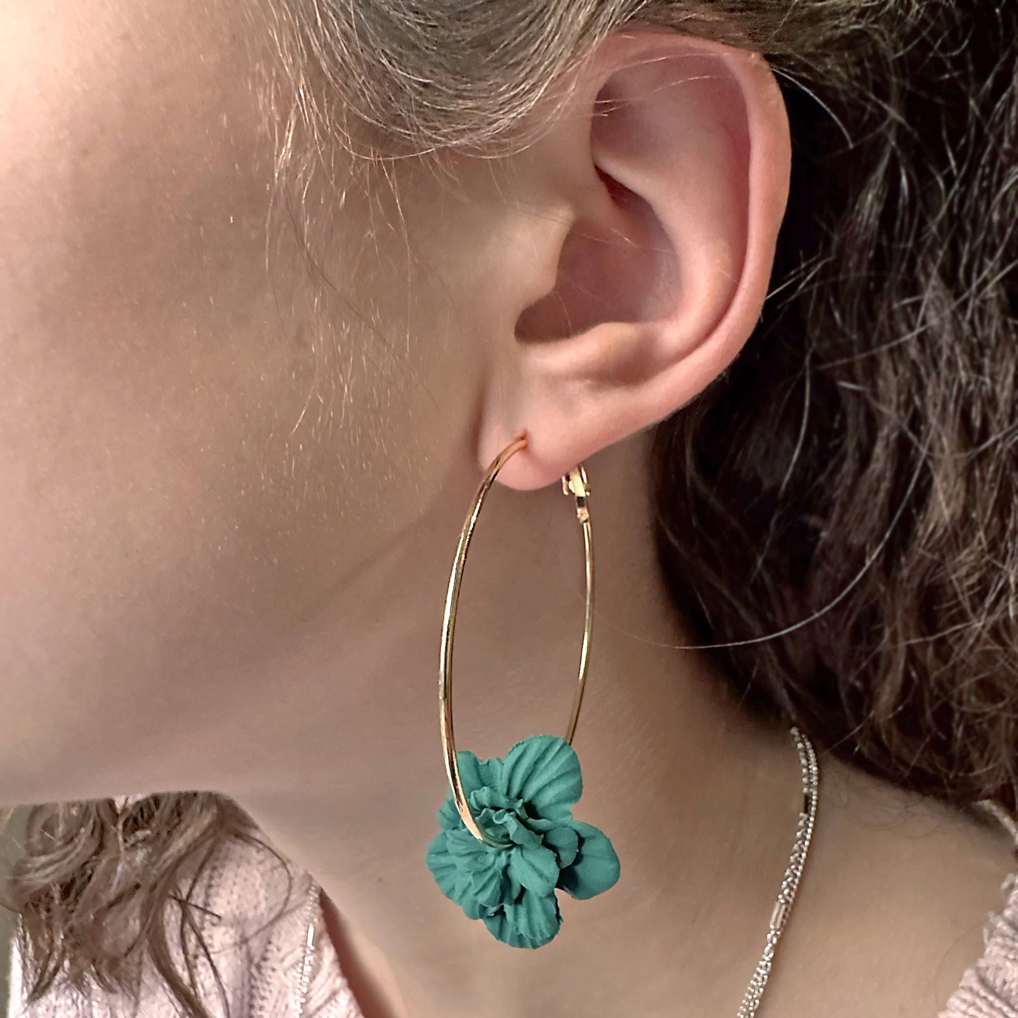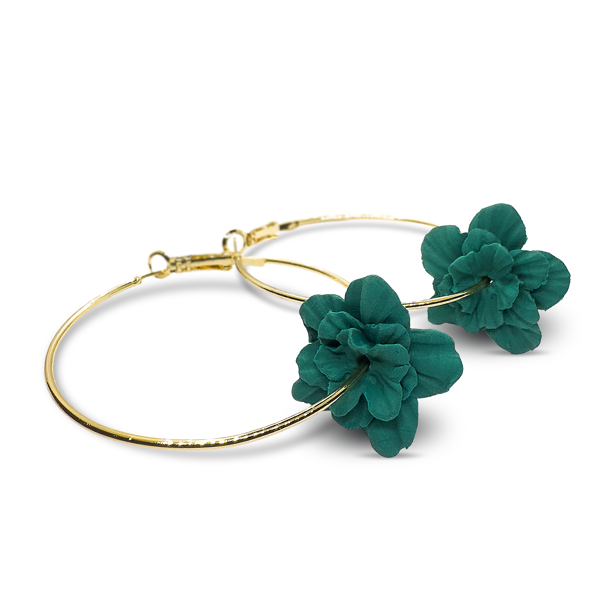 These elegant 50mm gold Flora Forest Green hoop earrings feature a beautifully crafted flower. Blending bold colour with timeless botanical charm. Lightweight and eye-catching, they add a refined, nature-inspired touch to both everyday outfits and special occasions. Certainly, a perfect statement piece for those who love modern floral jewellery.