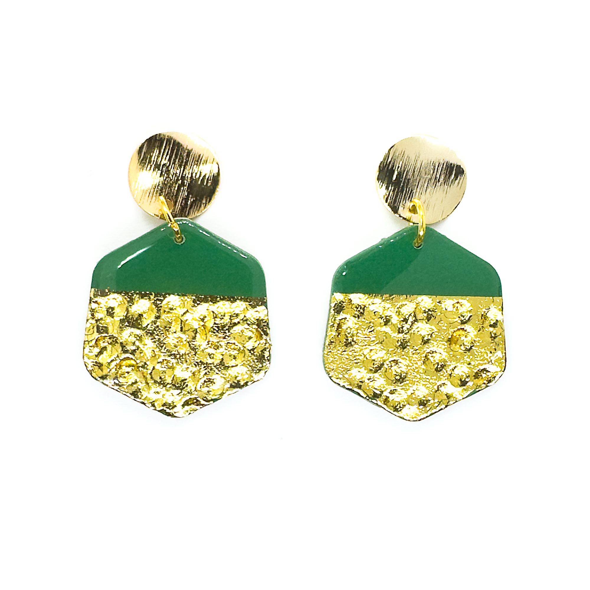 Introducing the Freya Hex Olive Earrings. These olive green hexagon-shaped polymer clay earrings have a beautiful beaten-metal gold leaf effect. This adds a rich texture and subtle shimmer to their modern geometric design. Additionally, the design is complemented with a high gloss resin coating. The elegant brushed gold round studs fixings further add to their earthy tones with contemporary sophistication. Lightweight, stylish, and eye-catching, they make a perfect statement piece for anyone who loves unique, artisan-crafted jewellery.