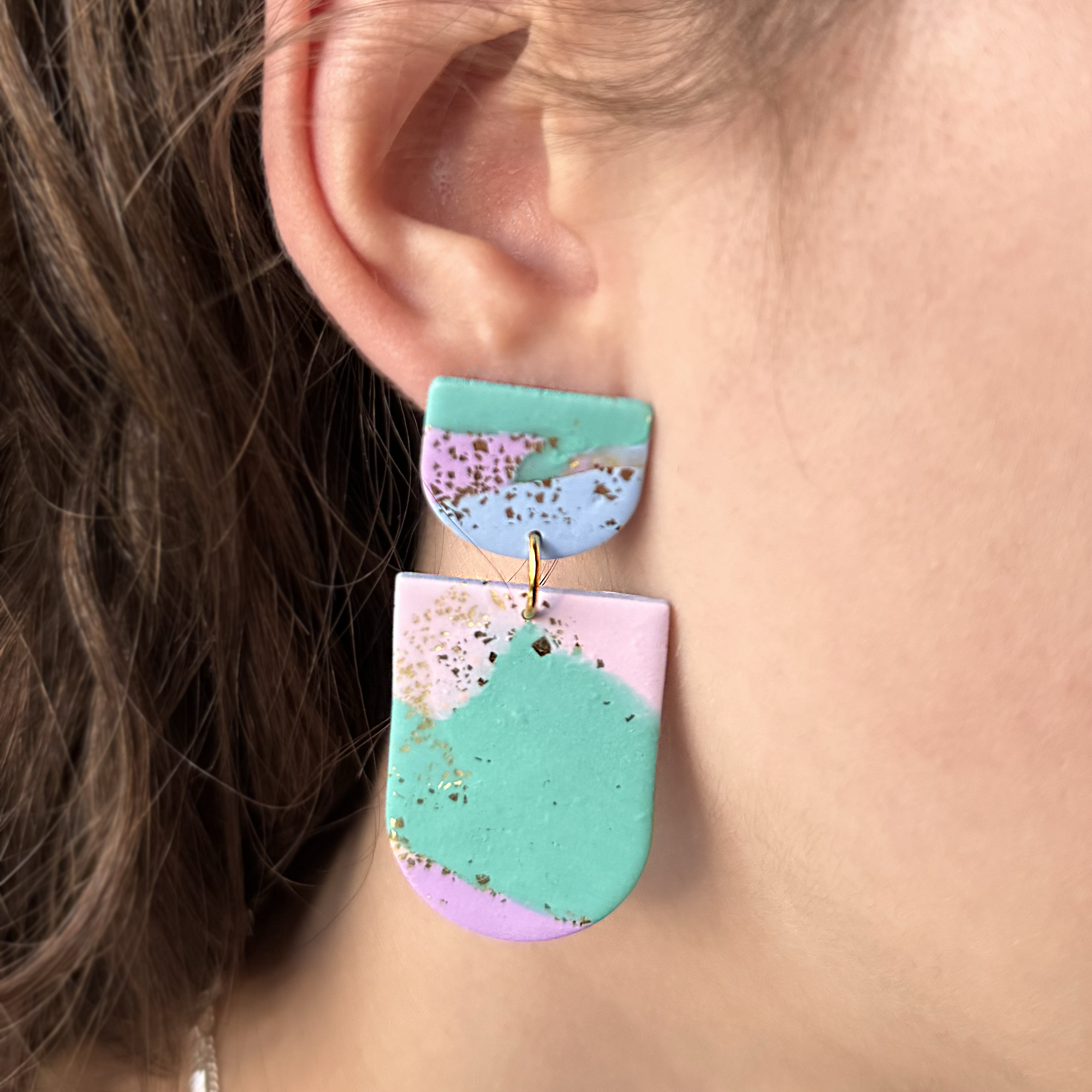 The Gloria Shield earrings are a bold and captivating piece. Drawing inspiration from the vibrant energy of 80s disco nights. It also features a striking palette of aqua, pinks, lilacs and blues, infused with shimmering flecks of gold leaf. Its bold shield shape further enhances its daring and dynamic design. Certainly making it a standout statement piece. Perfect for those looking to add a touch of retro glamour to their collection. Ideal for anyone seeking a blend of nostalgia and modern flair, the Gloria is a tribute to the colourful exuberance of the disco era.