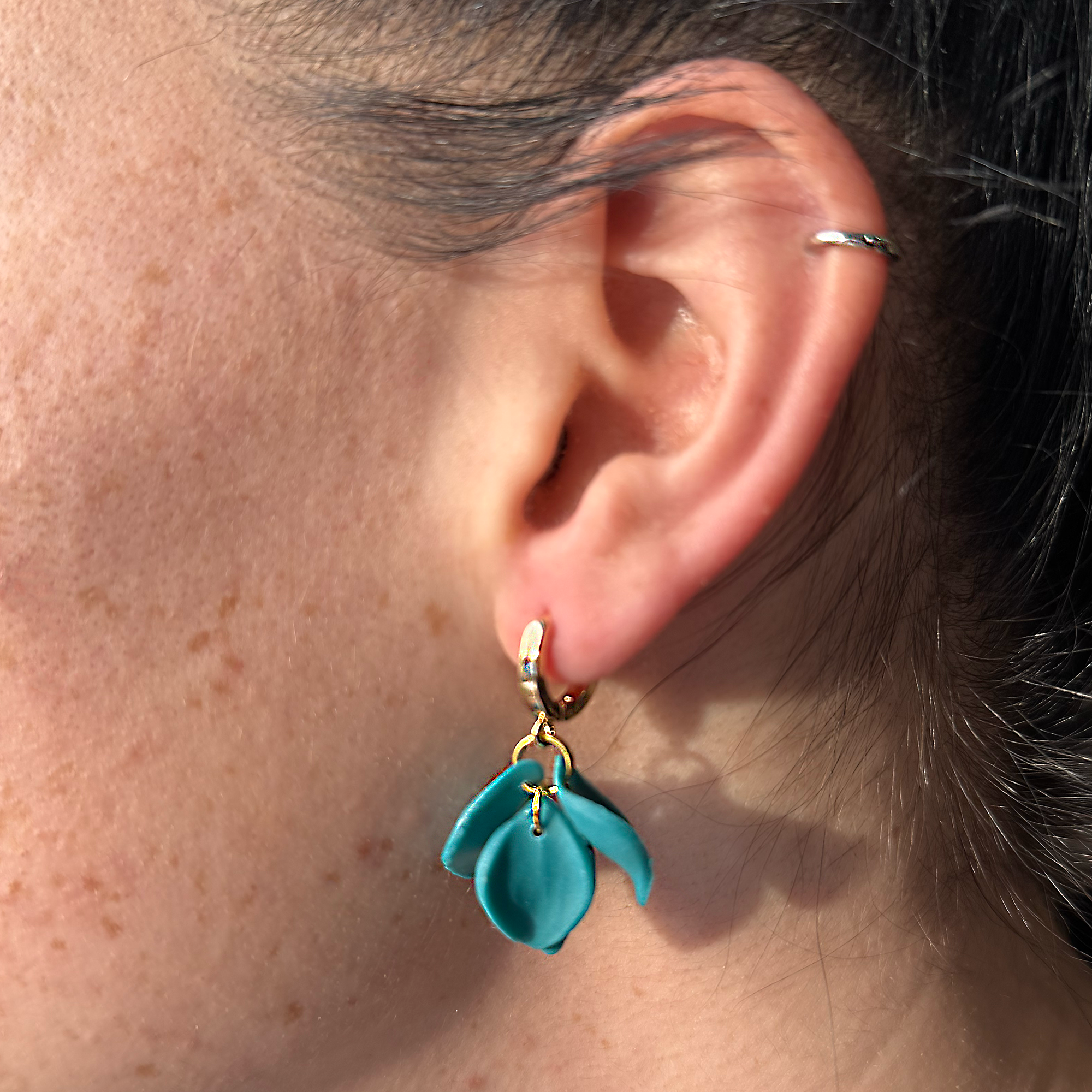 The delicate Heather Teal earrings showcase a beautiful cluster of individually crafted teal petals. These are gathered together to form a vibrant, sculptural bloom. Suspended from the trending gold huggie fixing. This offers a striking blend of bold colour, feminine charm and refined design. Especially lightweight and eye-catching, these earrings make the perfect statement piece for anyone who loves modern, artistic floral jewellery. Obviously, these will make a superb gift, if you can bear to part with them.