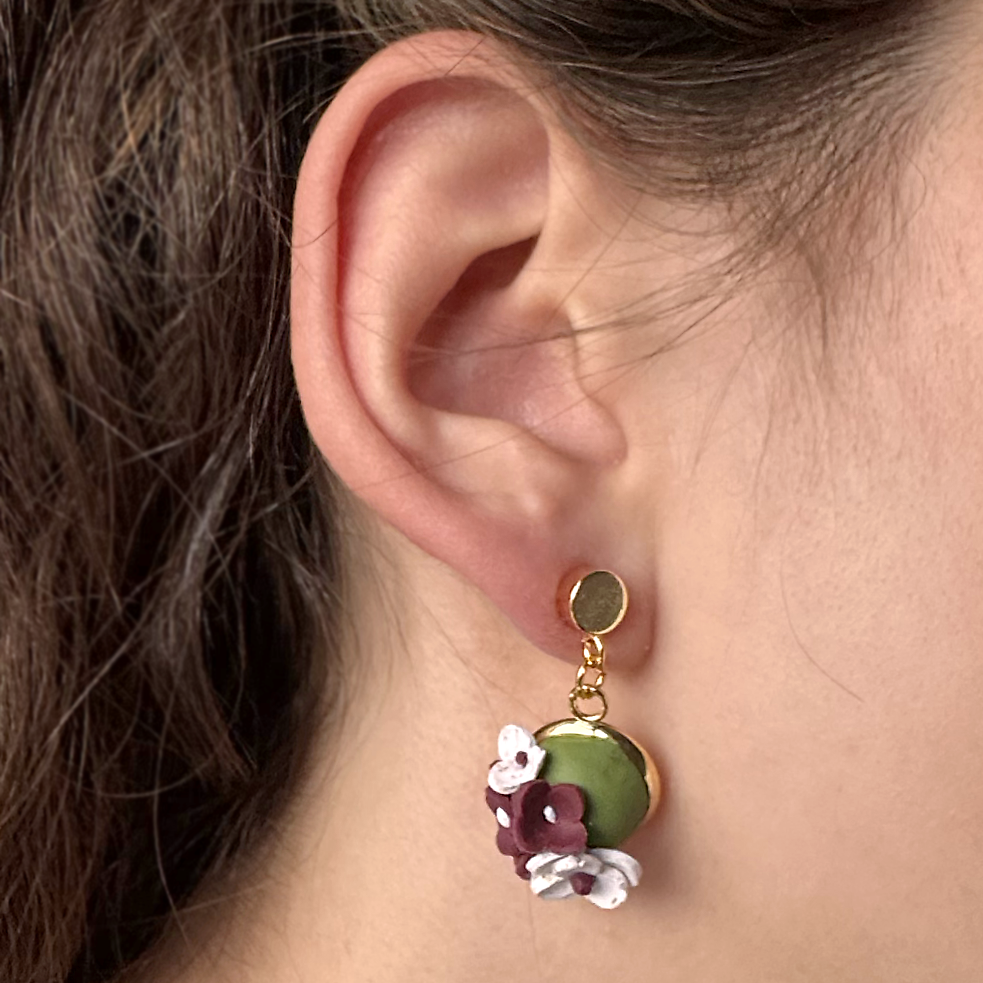 The Lillian drop earrings blend traditional and contemporary style in a stunning olive green hue, adorned with intricate burgundy and white blossoms. Perfect for everyday wear or special occasions, they add elegance and colour to any outfit. These finely crafted earrings celebrate timeless design with a modern twist, making them a must-have for unique and stylish fashion statements. Hypoallergenic jewellery.