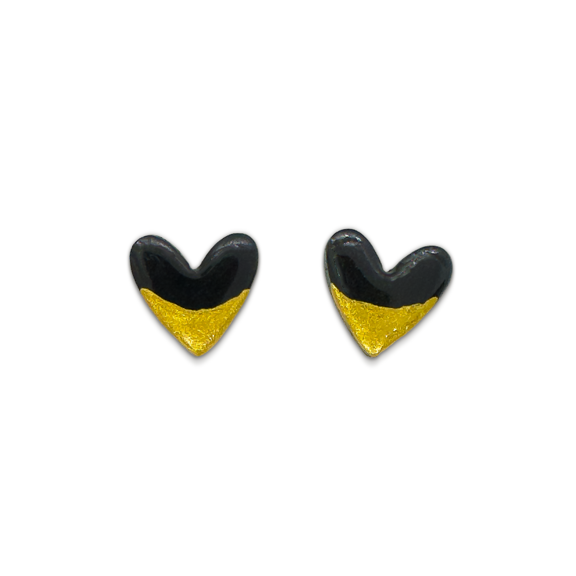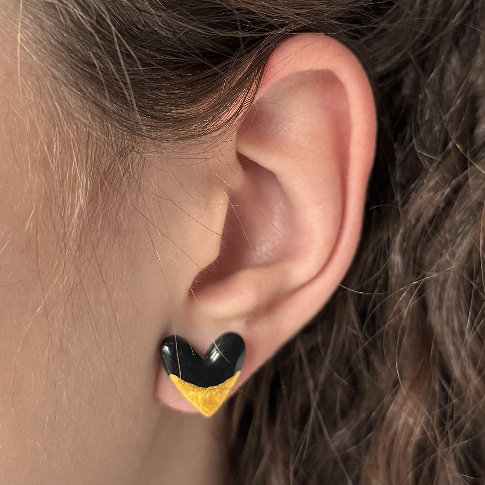 Explore the Ophelia Heart Earrings in Black and Gold. A delightful piece that enhances our Ophelia collection with its unique charm. These stunning earrings are crafted with a graceful heart shape. Elegantly embellished with radiant gold paint that adds a touch of luxury. The high-gloss resin finish adds a sleek and polished look, ensuring they stand out beautifully. Ideal for expressing your affection with sophistication, they are a versatile accessory that complements both casual and formal attire equally. So making them a perfect gift or a cherished addition to your own jewellery collection. Because we all need a little love sometimes.