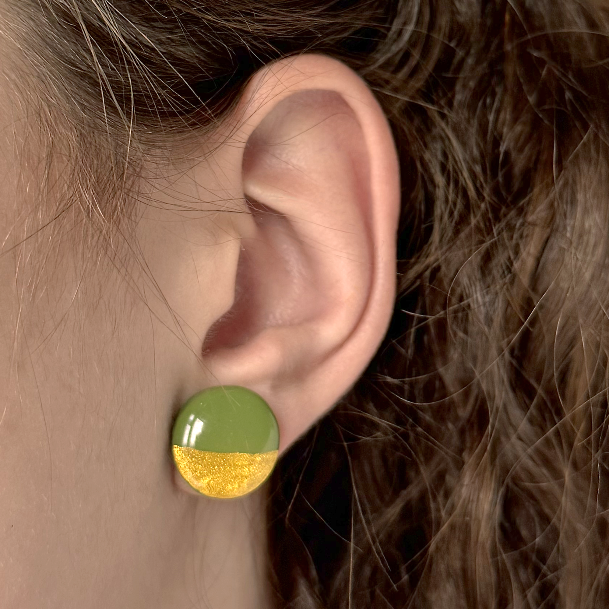 Introducing the Ophelia Round Earring in Olive Green and Gold– a blend of timeless elegance and artisanal craftsmanship. Handcrafted in a smooth ciruclar shape, these earrings are both stunning and practical for daily wear. Delicately handpainted with lustrous gold paint and sealed with high gloss resin, they offer luxury and durability. Elevate your jewellery collection with the Ophelia range, where classic style meets exquisite detailing. Hypoallergenic jewellery.