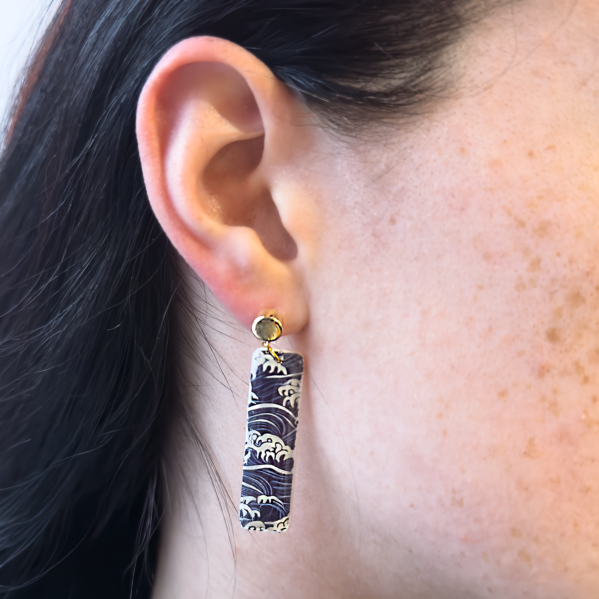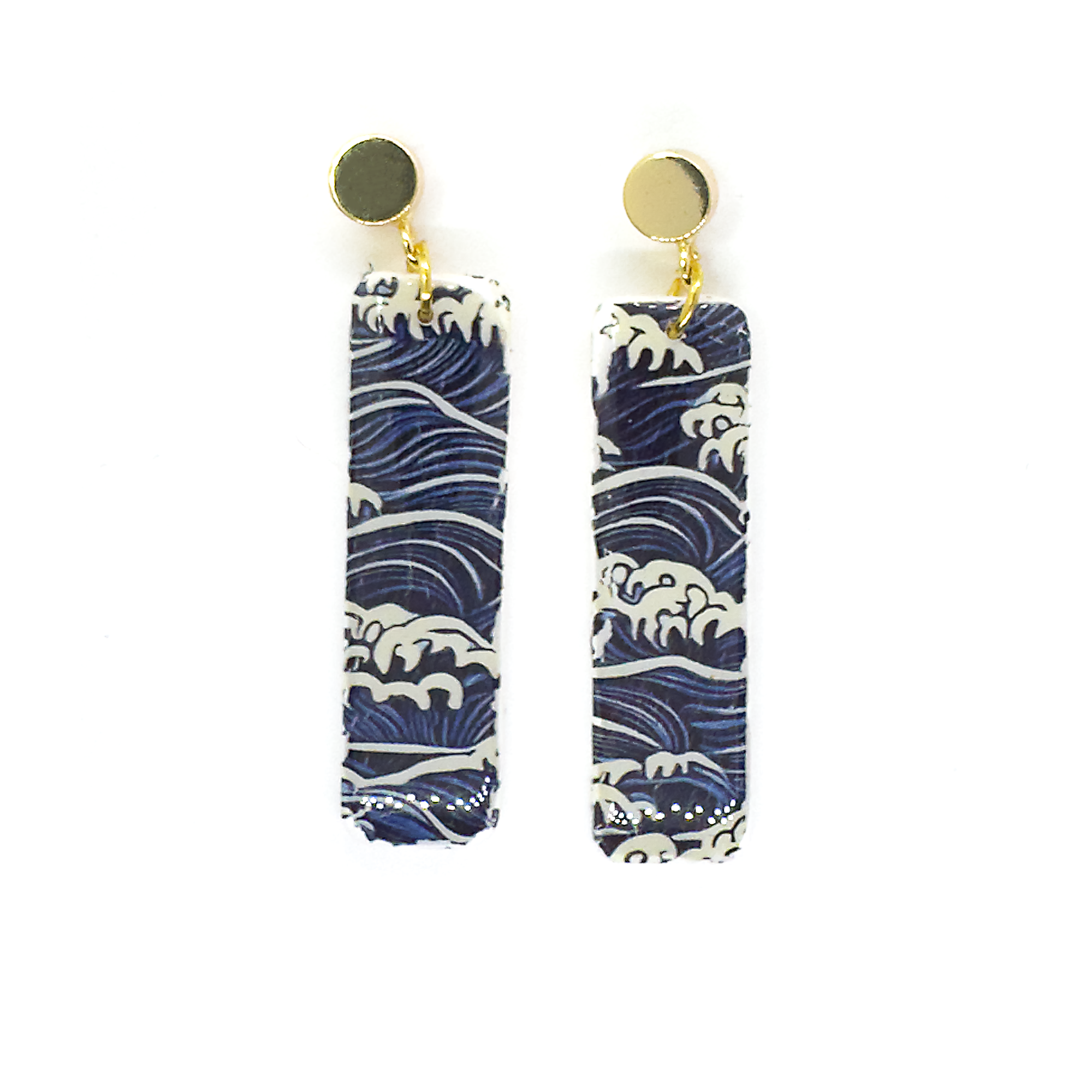 The Orinoco First Wave Bar Earrings showcase a deep blue and white wave-inspired pattern in a sleek, elegant bar shape, capturing the movement and contrast of ocean waters. Paired with a chunky, statement round gold-plated stud, these earrings blend modern sophistication with bold, artistic flair. Additionally, these lovelies are coated with a high-gloss resin shine. Finished to a high standard and designed to stand out. Certainly, they’re the perfect choice for anyone who loves distinctive, ocean-inspired jewellery. Part of our limited edition collection, these have purposefully been created in small batches. So your style remains truly individual.