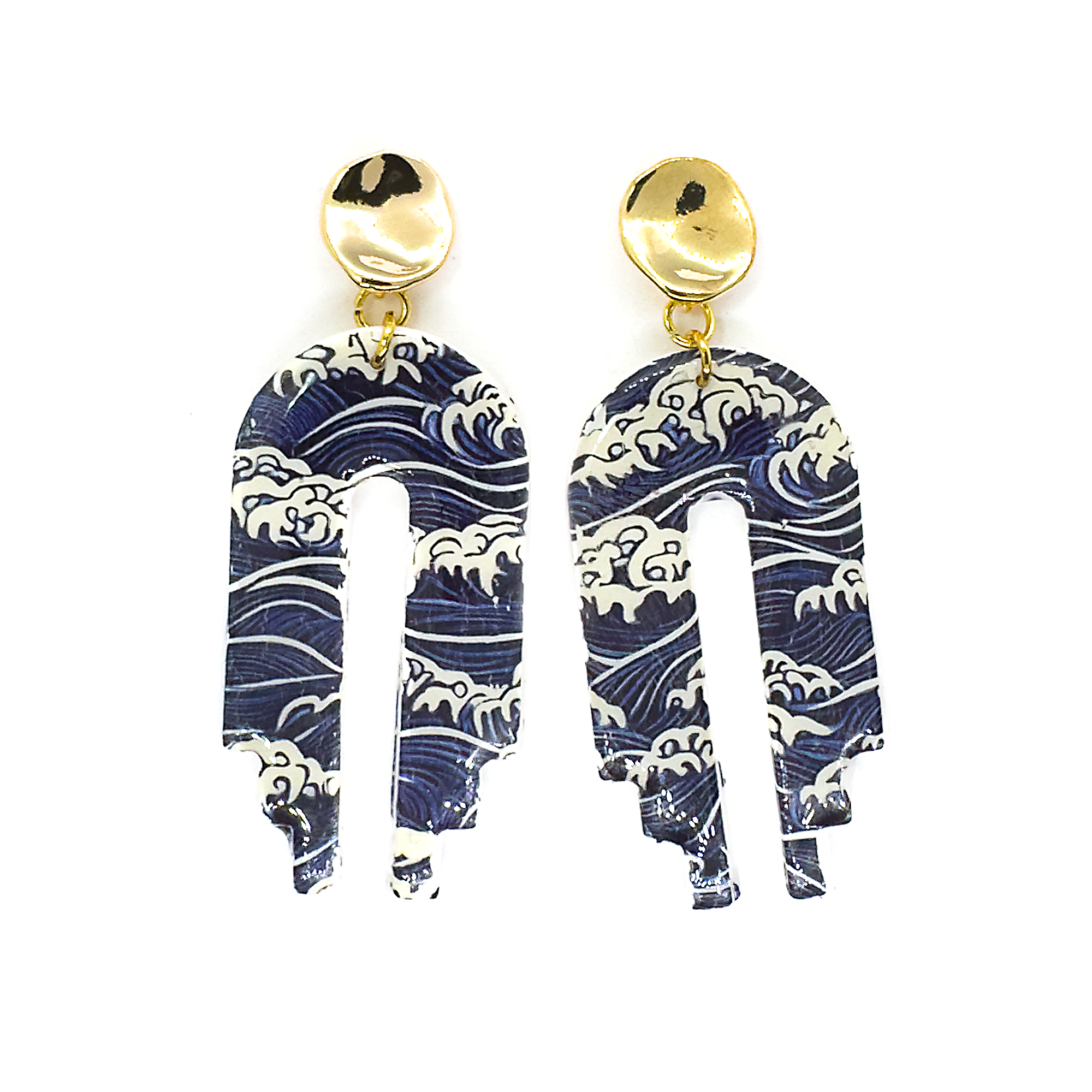 The Orinoco First Wave Earrings feature a deep blue and white wave-inspired pattern in a sleek, cascading chandelier design. Particularly made to capture the dynamic movement of ocean waters. Part of our limited edition collection, these have purposefully been created in small batches. So your style remains truly individual. Paired with a elegant statement round molten gold-plated stud, they combine modern elegance with bold, artistic style. Meticulously finished and designed to stand out, these earrings are the perfect choice for lovers of unique, ocean-inspired jewellery.