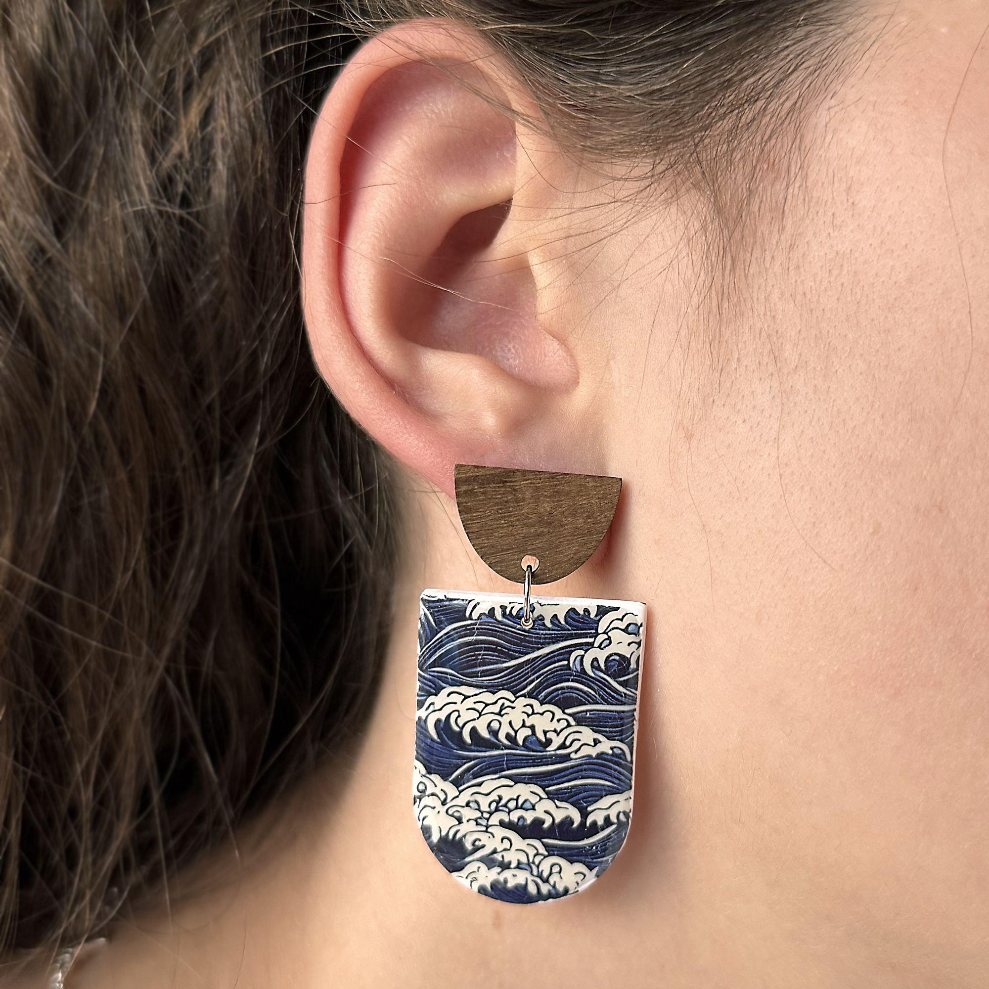 The Orinoco First Wave Shield Earrings showcase a bold shield-shaped drop in a deep blue and white wave pattern. Finished in high-gloss resin for exceptional depth and shine, these earrings create a striking, ocean-inspired statement perfect for lovers of modern, artistic jewellery.  Additionally complimented by the rustic half moon wooden studs. Part of our limited edition collection, these have purposefully been created in small batches. So your style remains truly individual.