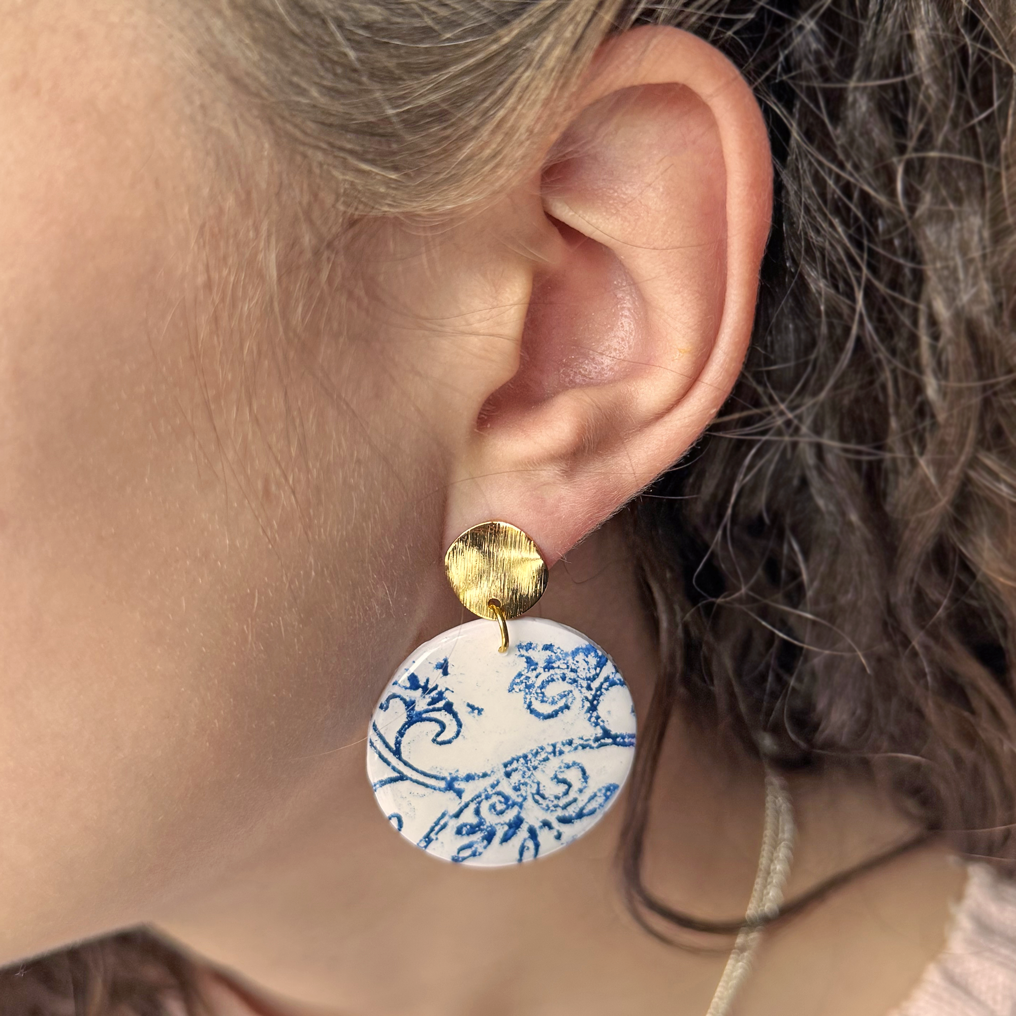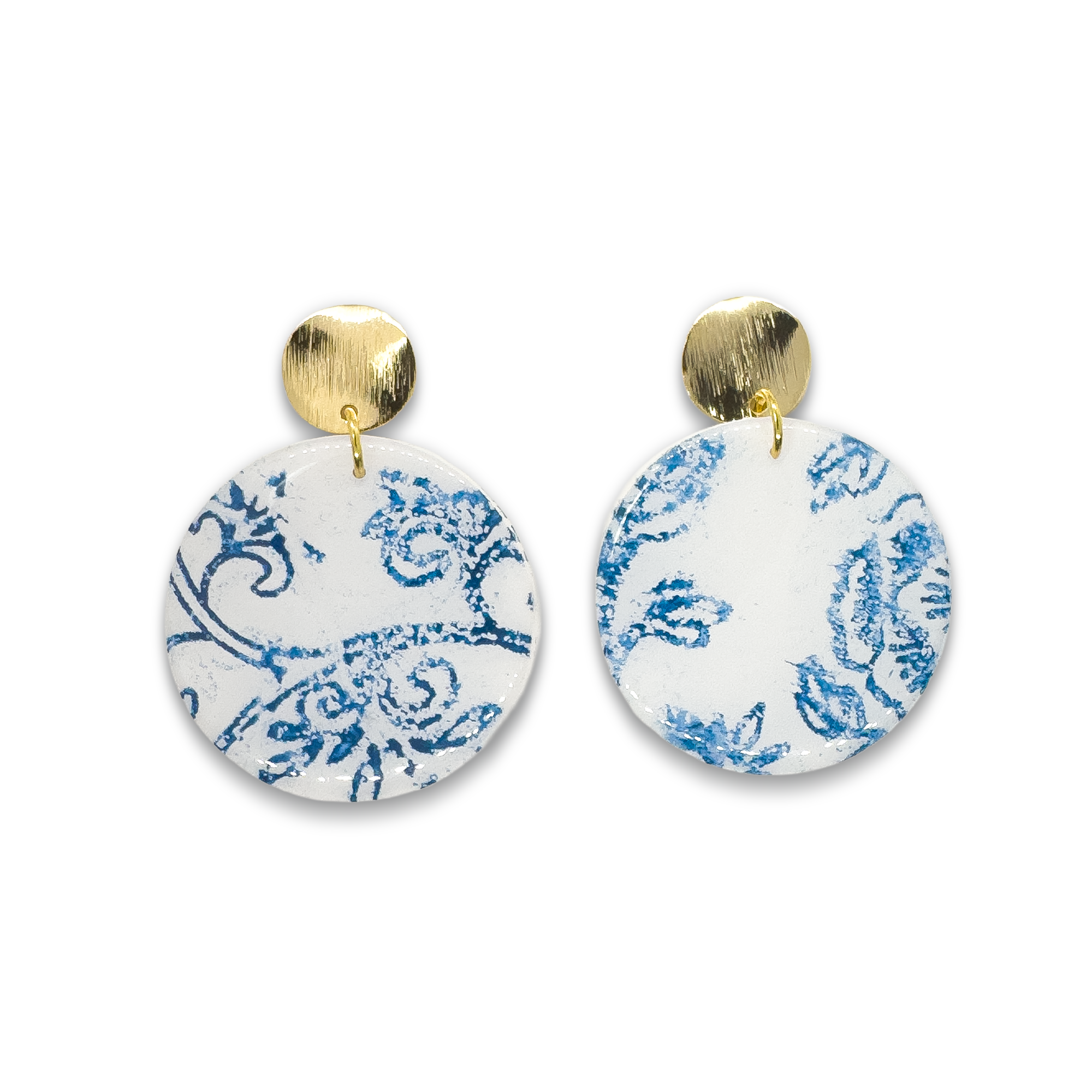 The Willow Blue Round Earrings are a stunning addition to your collection. They combine the delicate timeless beauty of porcelain with a bold and impactful design. Featuring a larger round shape, these earrings showcase a captivating colour contrast that draws the eye. While the vibrant blue hue is beautifully balanced by a brushed gold stud, adding a touch of sophistication and elegance. The design is further enhanced with a high-gloss resin finish. Undoubtedly, this combination results in a striking and statement-worthy finish. Making the Willow Blue Round Earrings a perfect choice for those looking to add a touch of glamour to any outfit.